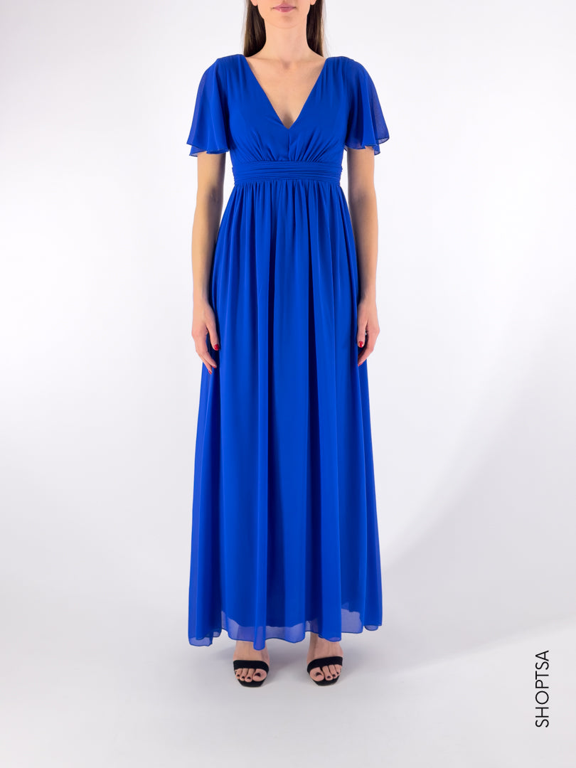 Abito lungo color bluette Scollatura a V davanti Maniche corte ad aletta Motivo plisettato in...