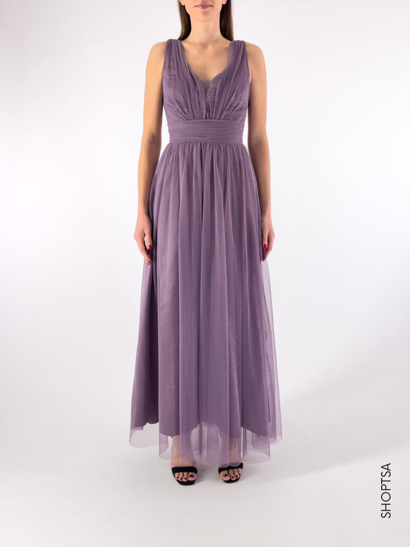 Abito lungo con tulle leggermente glitterato Scollatura davanti e dietro Fiocco in vita Elastico nella...