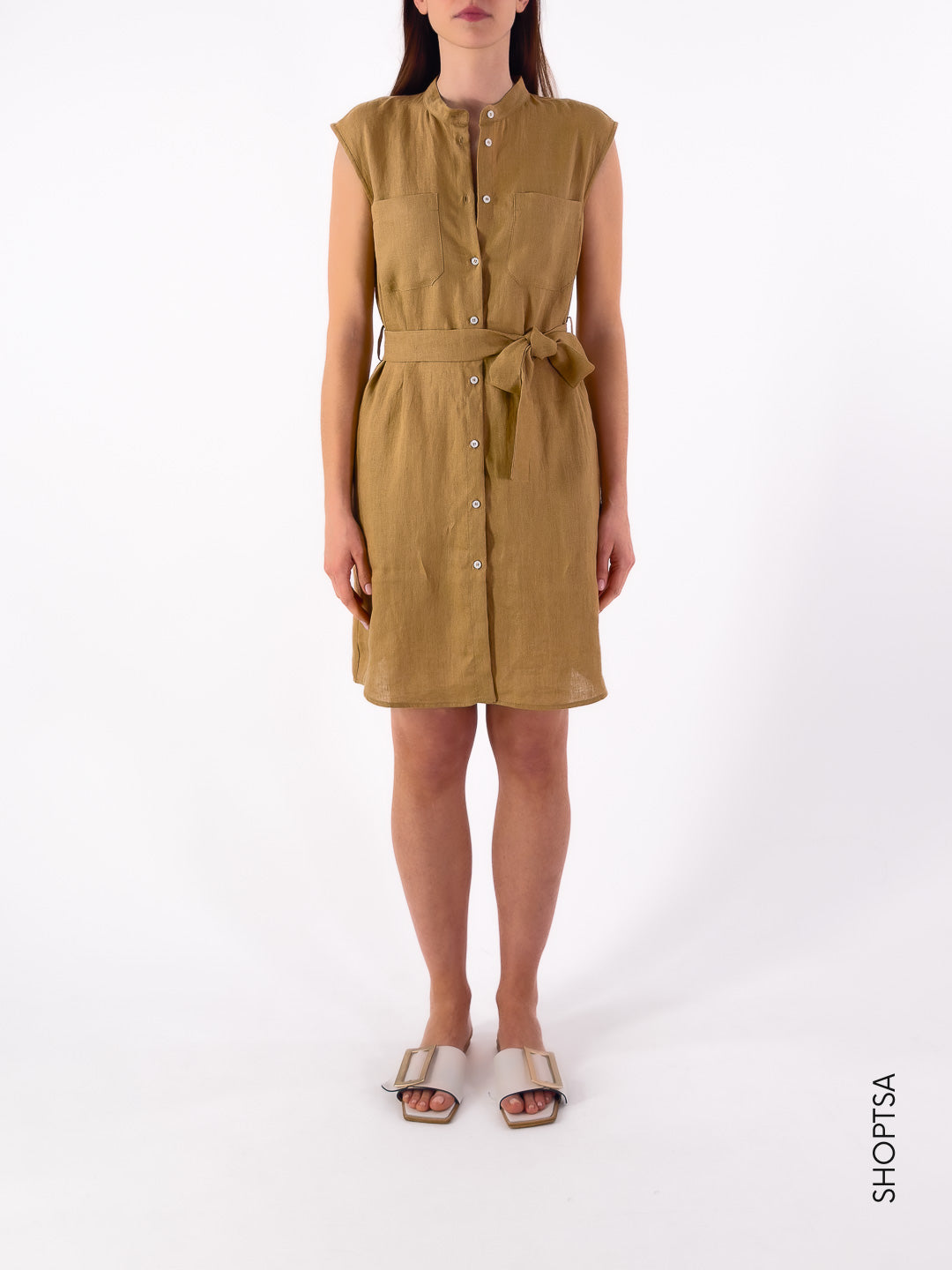 Abito corto in tela di puro lino leggera Tasche laterali Cintura coordinata Colletto coreana Composizione:...