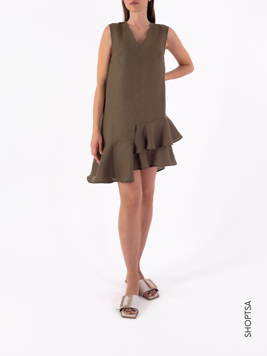 Abitino corto in lino Scollatura a V con spalla ampia Fondo con balza assimmetrica Comodo...