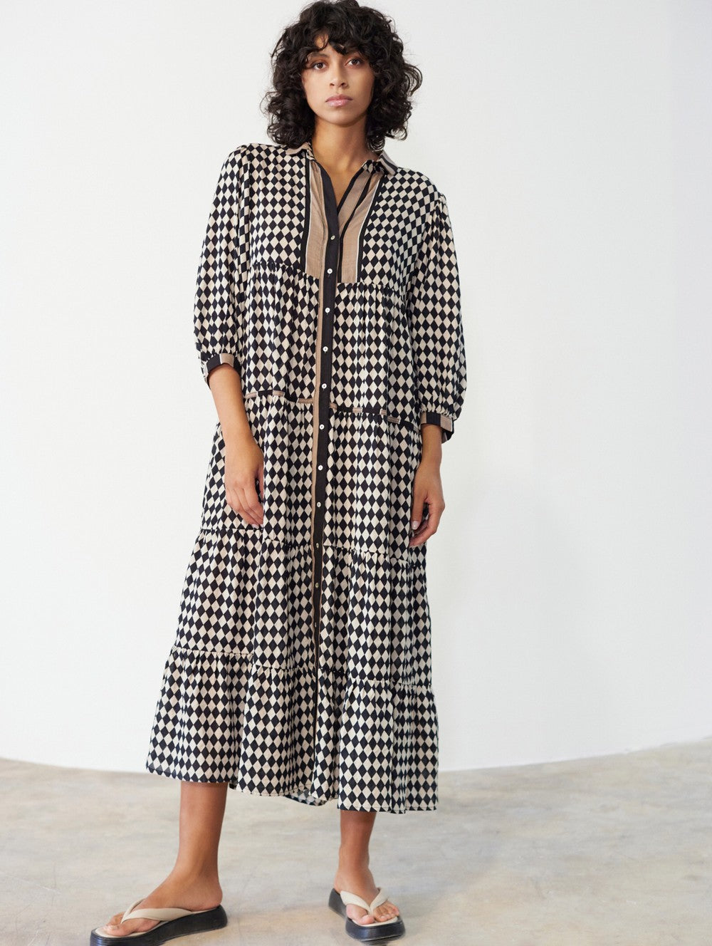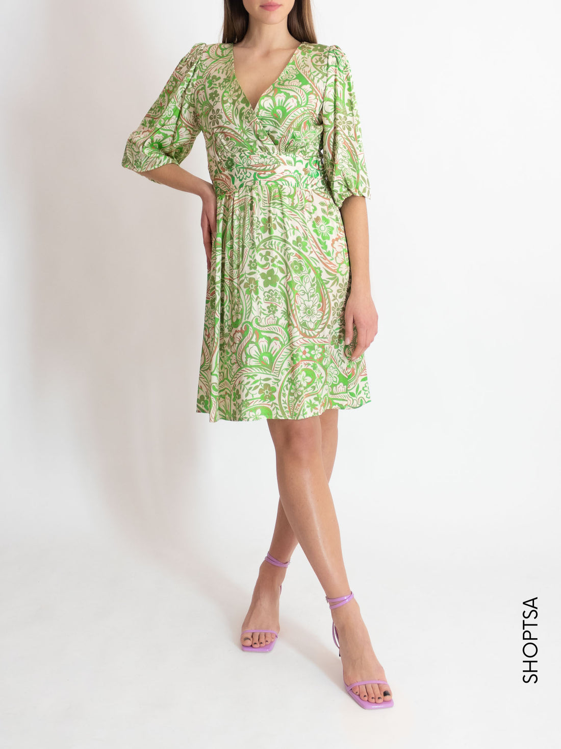 Abito in georgette stampata Modello corto con balza la fondo Manica tre quarti con bottone...