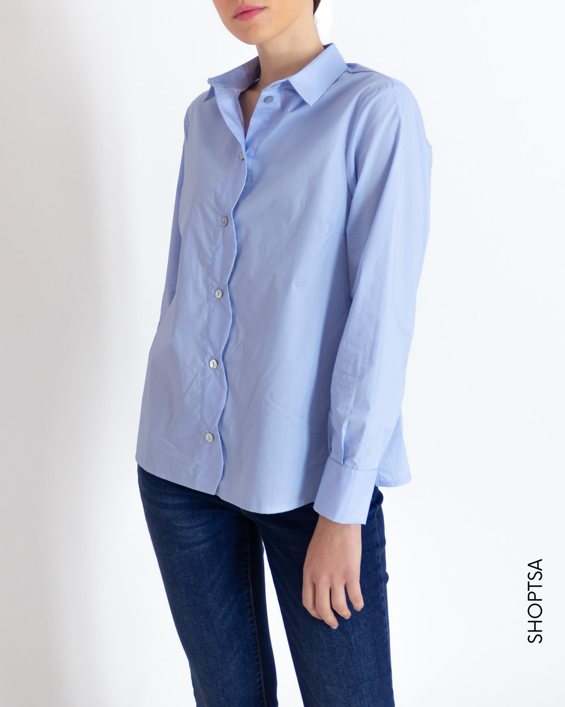 Camicia azzurra in popeline di cotone Vestibilità dalla linea a trapezio Dettaglio onde in cucitura...