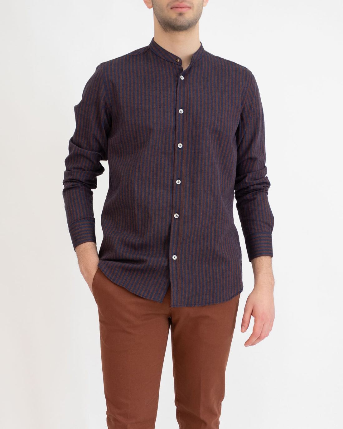 Camicia in misto lino e cotone Micro riga blu e marrone Collo coreana e chiusura...