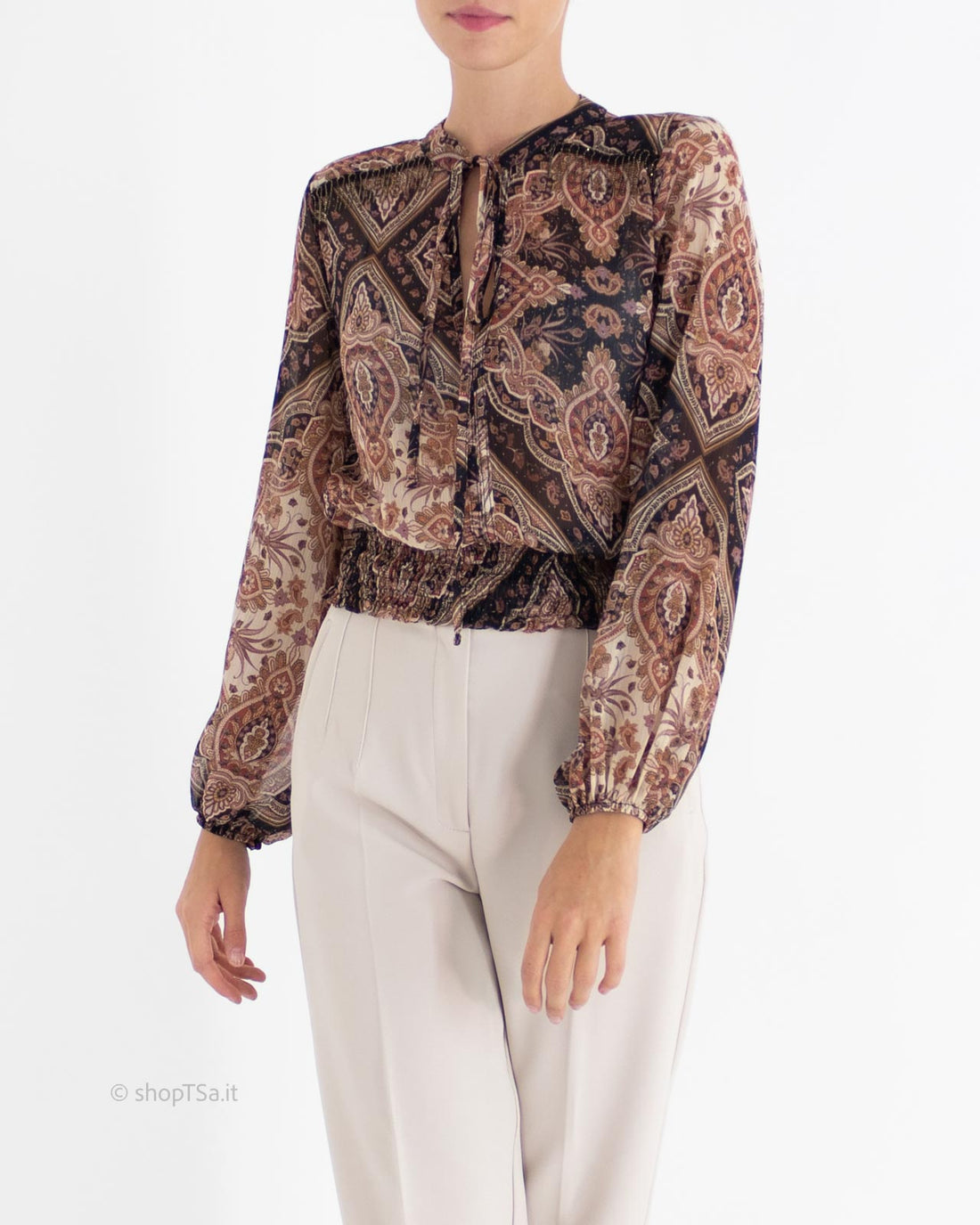 Camicetta in georgette stampata con perline spalle Fantasia realizzata nelle tonalità del marrone Elastico nel...