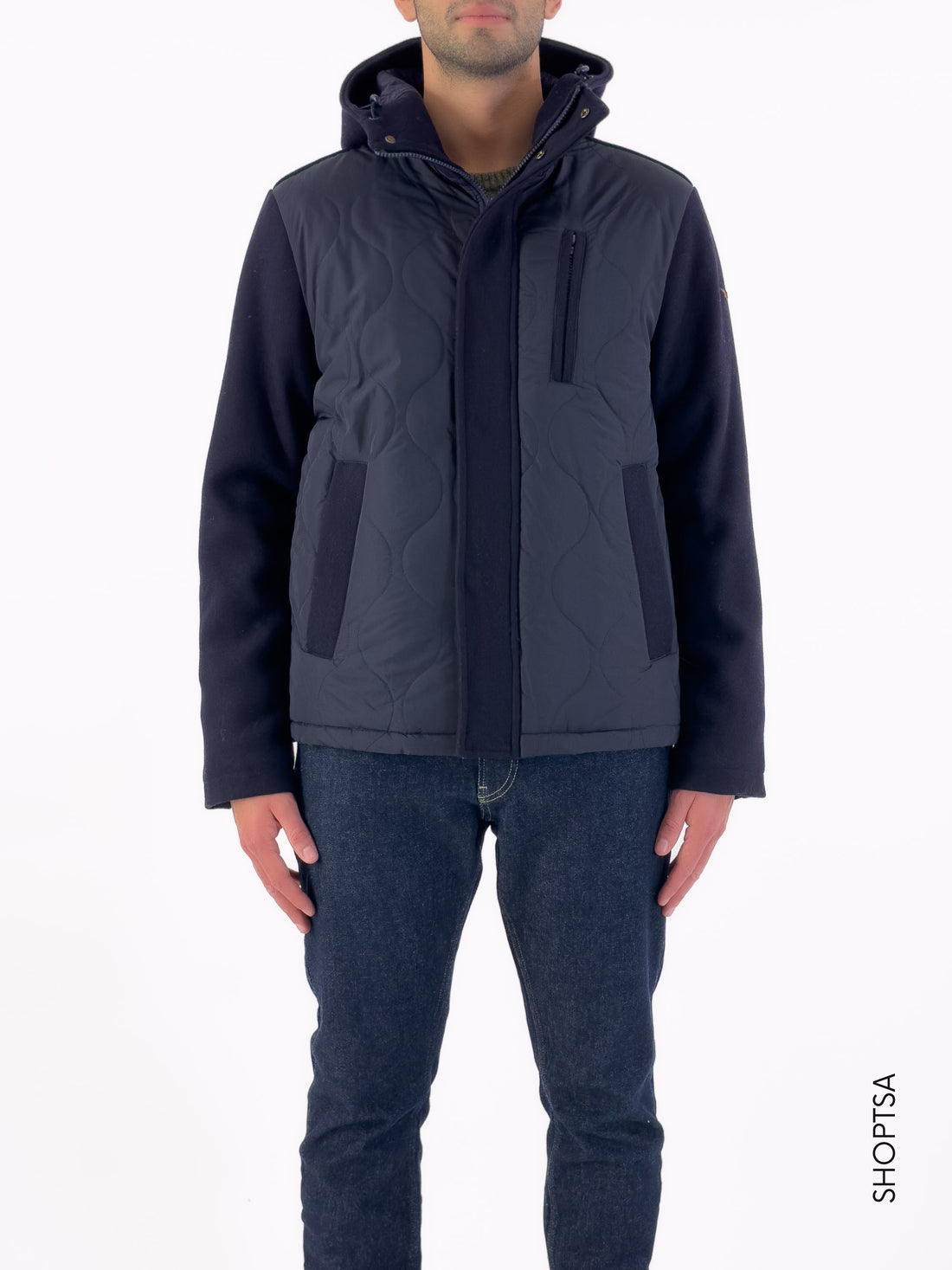 Giubbotto con doppio tessuto, lana e nylon Cappuccio avvolto con bottone automatico Chiusura con zip...