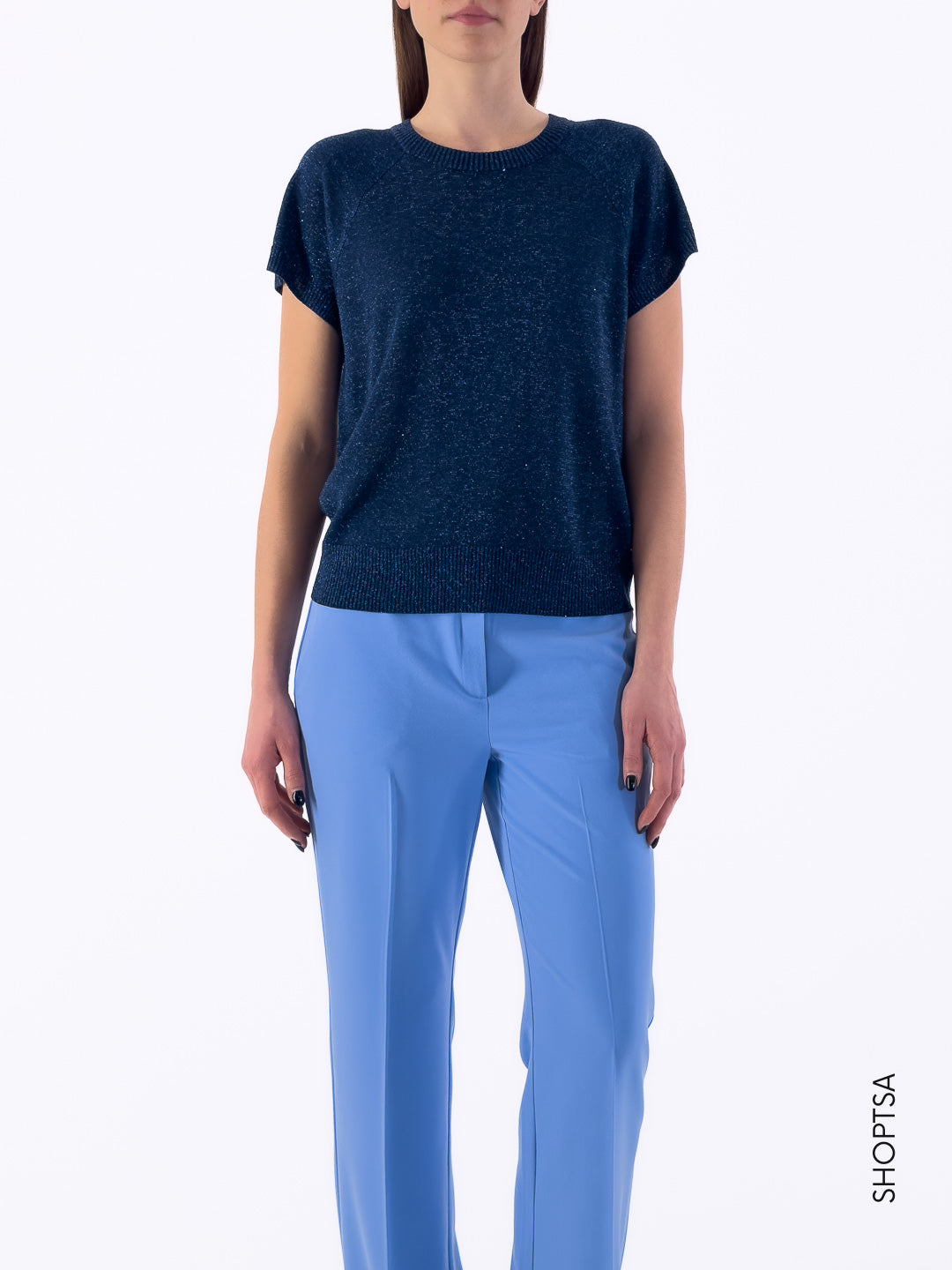 Maglia in morbida viscosa blu, modello girocollo con manica tre quarti. Dettaglio della balza nel...