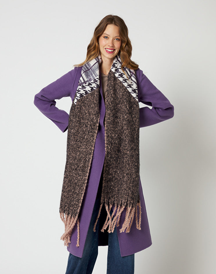 Sciarpa rettangolare in morbido tessuto Frange laterali color cipria Foulard a fantasia applicato al centro...
