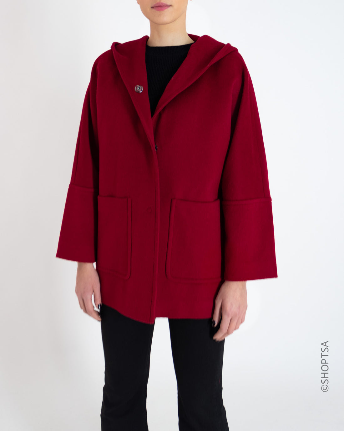 Short cape-style coat in 100% wool Kimono sleeve with hidden buttons Patch pockets on the...