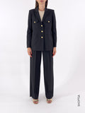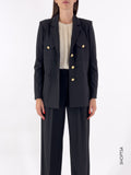 - Chiusura con bottoni in metallo, tasche alte applicate con patta, basse a filetto